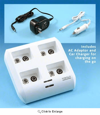 The Titanium Professional Smart Charger has a microprocessor to safely and accurately charge each battery to its fullest optimal capacity: no more overcharged or undercharged batteries! Two independent charging circuits enable 4 different 9v rechargeable batteries to be charged at the same time or individually, regardless of their initial charged state. Separate LED displays indicate the charge status of each battery. Temperature protection prevents overcharging, batteries can be left in the charger to remain fully charged before use. The charger keeps the batteries fully charged by providing a trickle charge current. Circuit / polarity protection ensures safety and prevents accidental damage to batteries.